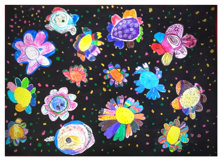 Το φόντο είναι μαύρο κάνσον βαμμένο πουαντιγιέ με τέμπερα. Τα λουλούδια είναι ζωγραφισμένα σε χαρτί με μαρκαδόρους και κηροπαστέλ. Αφού πλαστικοποιηθούν, για να δείχνουν γυαλιστερά, τα κολλούμε στο φόντο.